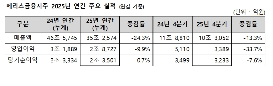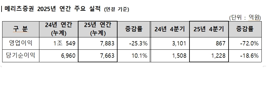 이미지 확대보기메리츠증권은 2025년 연결 기준 영업이익 7883억원, 당기순이익 7663억원을 기록했다고 밝혔다. 순이익은 전년 대비 10.1% 증가했다.