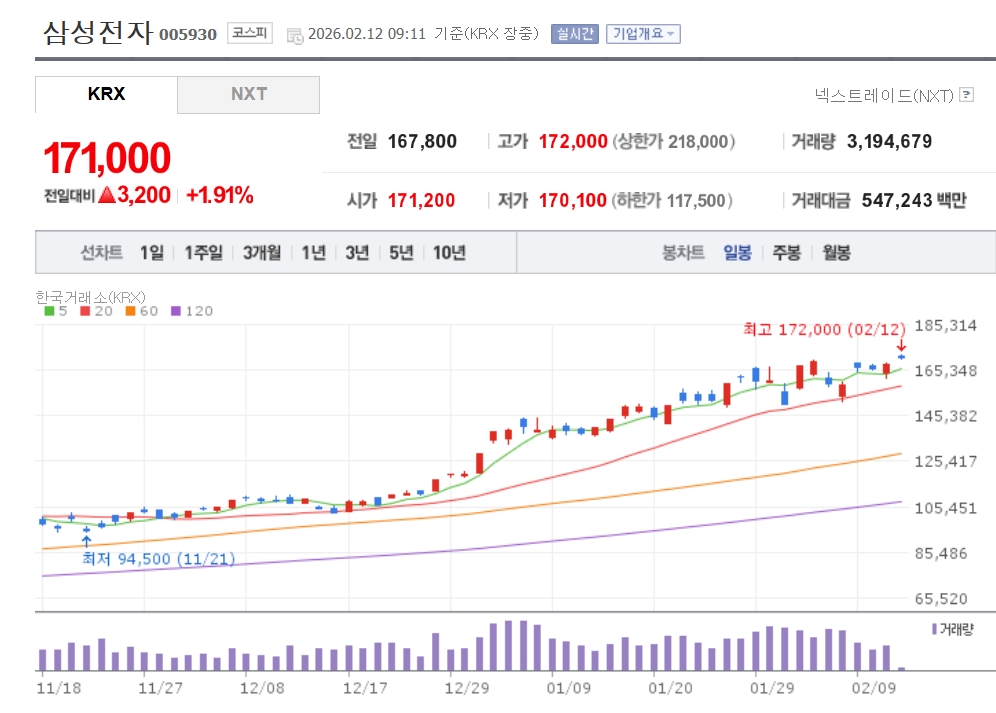 이미지 확대보기12일 한국거래소에 따르면 삼성전자는 오전 9시11분 전일대비 1.91% 오른 17만1000원을 기록하고 있다. 이날 장중 17만2000원을 터치하며 최고가를 다시 썼다. SK하이닉스는 2.44% 오른 88만1000원을 기록중이다.