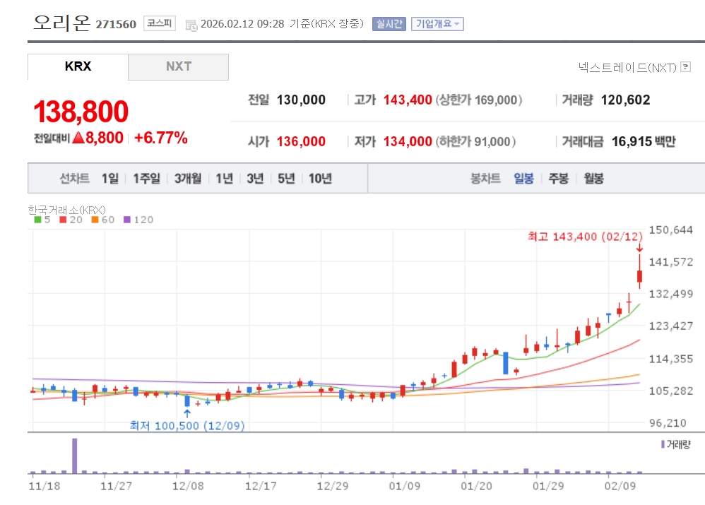 이미지 확대보기6일 한국거래소에 따르면 오전 9시 28분 기준 오리온은 전 거래일 대비 6.77% 오른 13만8800원에 거래되고 있다.