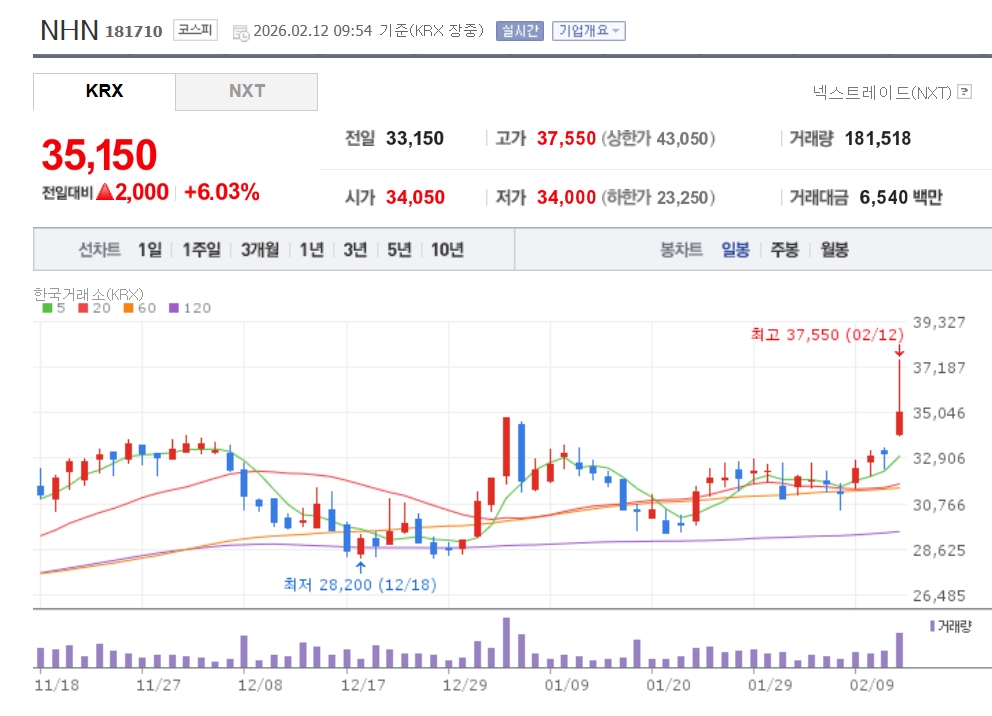 이미지 확대보기12일 한국거래소에 따르면 오전 9시 54분 기준 NHN은 전 거래일 대비 6.03% 오른 3만5150원에 거래되고 있다. 장중 3만7700원까지 오르며 1년 중 최고가를 경신했다.