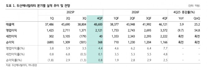 4분기 연결 매출액은 4조9000억원으로 전년 동기 대비 5.9% 증가했다. 영업이익은 2121억원으로 전년 대비 9.7% 감소했다. 유 연구원은 “두산밥캣은 1083억원으로 56.4% 감소했고, 두산퓨얼셀은 766억원 적자로 전환했다”며 “반면 에너빌리티 부문 영업이익은 1679억원으로 166.5% 증가했다”고 분석했다. 자회사 기여도 하락에도 에너빌리티 부문 개선으로 전사 영업이익률은 4.4%를 기록했다.