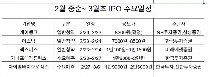 설 이후 시장의 온기는 케이뱅크의 흥행 여부에 달려 있다. 특히 조 단위 기술수출 성과를 낸 아이엠바이오로직스 같은 실물 기반 바이오주들이 침체된 바이오 IPO 섹터의 불씨를 살릴 수 있을지가 향후 관전 포인트다.