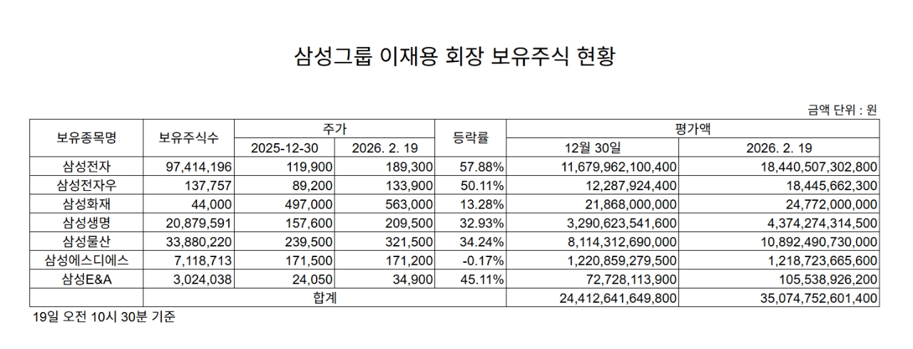 [표] 이재용 회장 상장주식 현황(2월 19일 오전 10시 30분 현재)