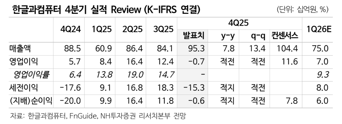 별도 기준 매출액은 393억원으로 6.8% 감소했고, 영업이익은 43억원으로 44.6% 줄어 컨센서스를 밑돌았다. 심 연구원은 “포괄임금체계 전환에 따른 퇴직급여충당부채 약 50억원이 판관비에 일괄 반영되며 수익성이 훼손됐다”며 “한컴라이프케어는 매출 348억원으로 11.1% 증가했지만, 저마진 프로젝트 매출 인식 영향 등으로 영업적자 31억원을 기록했다”고 분석했다.