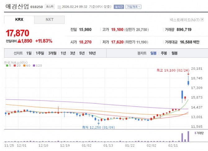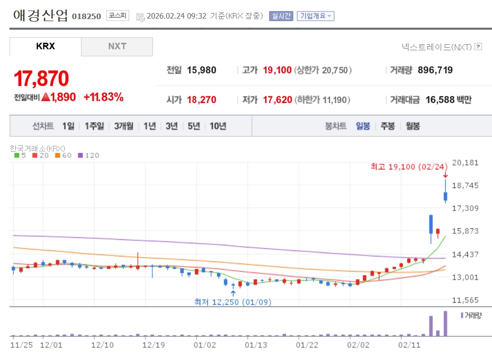 이미지 확대보기24일 한국거래소에 따르면 오전 9시 32분 기준 애경산업은 전장 대비 11.83% 오른 1만7870원에 거래되고 있다. 개장 직후에는 1만9100원까지 치솟기도 했다.
