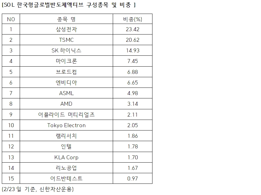 신한자산운용 김정현 ETF사업총괄은 "반도체 산업은 기술 변화와 업황 사이클에 따라 주도 섹터가 빠르게 바뀌는 만큼, 트렌드 변화 구간에서는 종목 구성과 비중 조절이 핵심"이라며 "메모리(HBM)와 파운드리 중심 전략에 더해 장비·설계·테스트까지 아우르는 액티브 운용으로 시장 변화에 대응하고 있다"고 말했다.