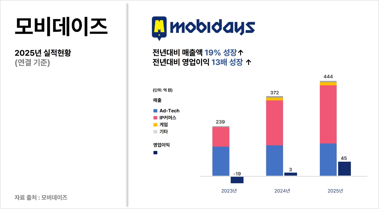 이미지 확대보기모비데이즈는 2025년 연결 기준 매출 444억 원, 영업이익 45억 원을 기록했다. 매출은 전년 대비 약 19% 증가했으며, 영업이익은 13배 이상 성장하며 이익 중심의 사업 구조 전환이 가시화됐다. 외형 성장과 수익 기반 강화가 동시에 이뤄졌다는 점에서 의미가 크다.