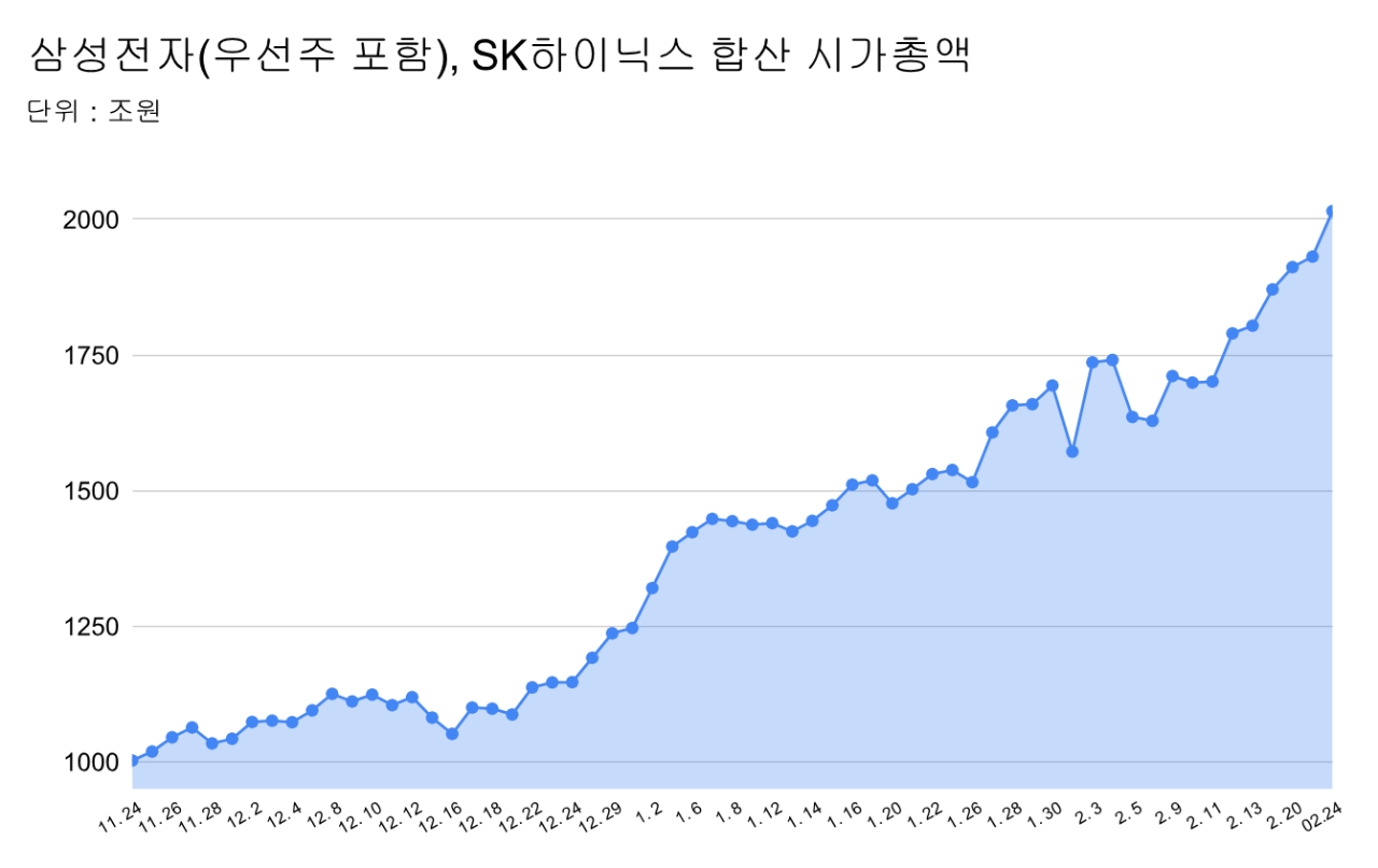 합산 시총은 지난해 11월 말 1000조원 수준에서 출발해 연말 1246조원, 올해 1월 중순 1500조원을 돌파했고, 2월 들어 가속도가 붙으며 2000조원을 넘어섰다. 연초 대비 약 700조원이 증가했다.