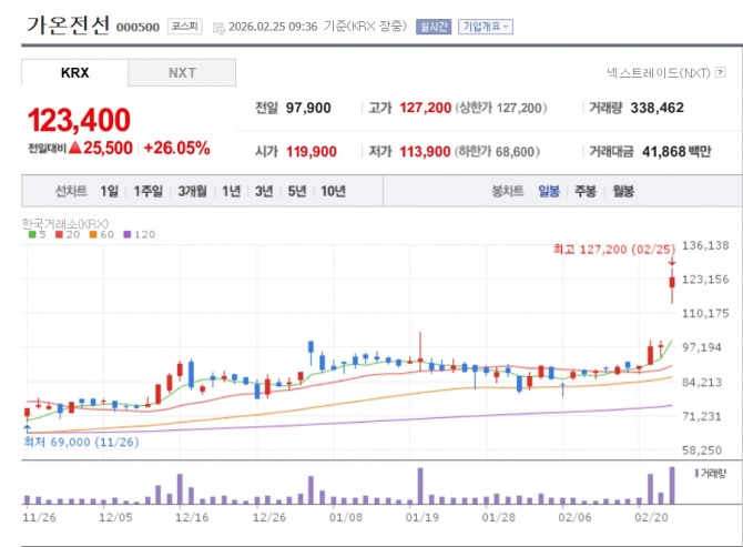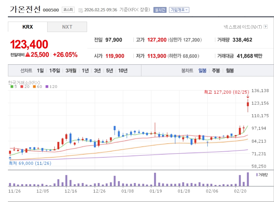 이미지 확대보기25일 한국거래소에 따르면 오전 9시36분 기준 가온전선은 전 거래일 대비 26.05% 오른 12만3400원에 거래되고 있다.
