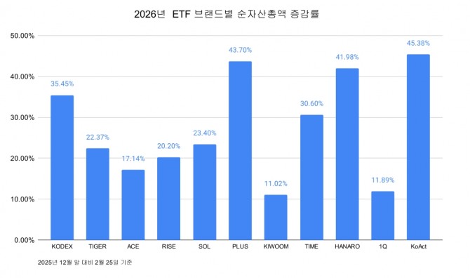 두 브랜드의 증가액을 합하면 62조 원으로, 전체 증가분의 약 75% 이상을 차지한다. ETF 시장에서도 대형 운용사 중심의 자금 집중 현상이 강화되고 있다는 의미다.