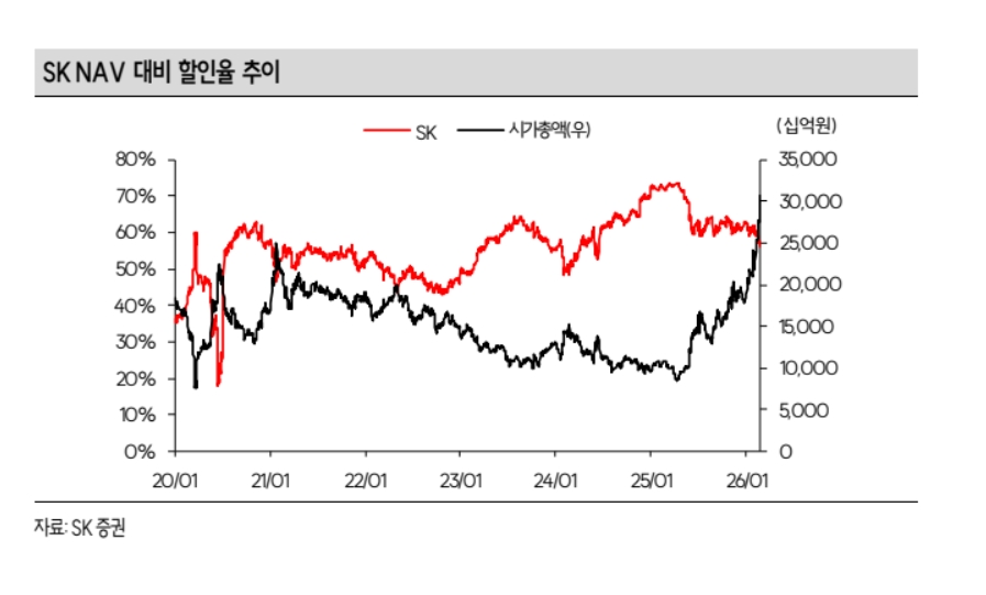 또 “지난 25일 국회 본회의를 통과한 3차 상법 개정안에 따라 SK가 보유한 자사주(24.8%)의 가치가 부각될 것으로 예상되고, 시가총액에 연동된 배당정책에 따라 안정적인 배당수익률도 기대할 수 있다”고 덧붙였다.
