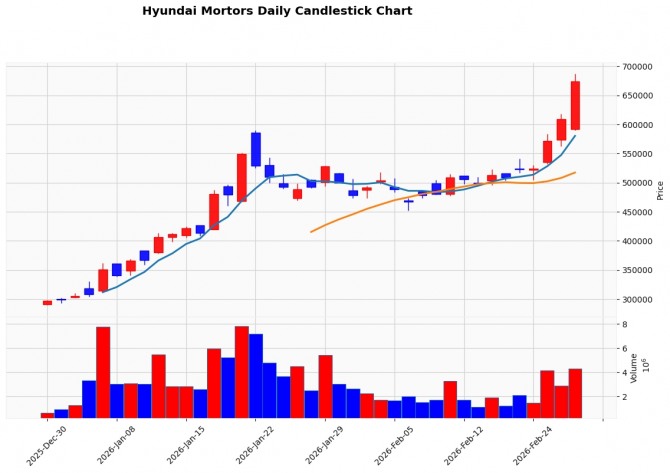 이미지 확대보기27일 한국거래소에 따르면, 현대차는 전 거래일 대비 10.67%(6만5000원) 오른 67만4000원에 거래를 마쳤다. 장중 한때 14% 넘는 상승률을 기록했다. 시가총액은 138조1000억원으로 확대되며 코스피 시가총액 상위권 지위를 재확인했다.