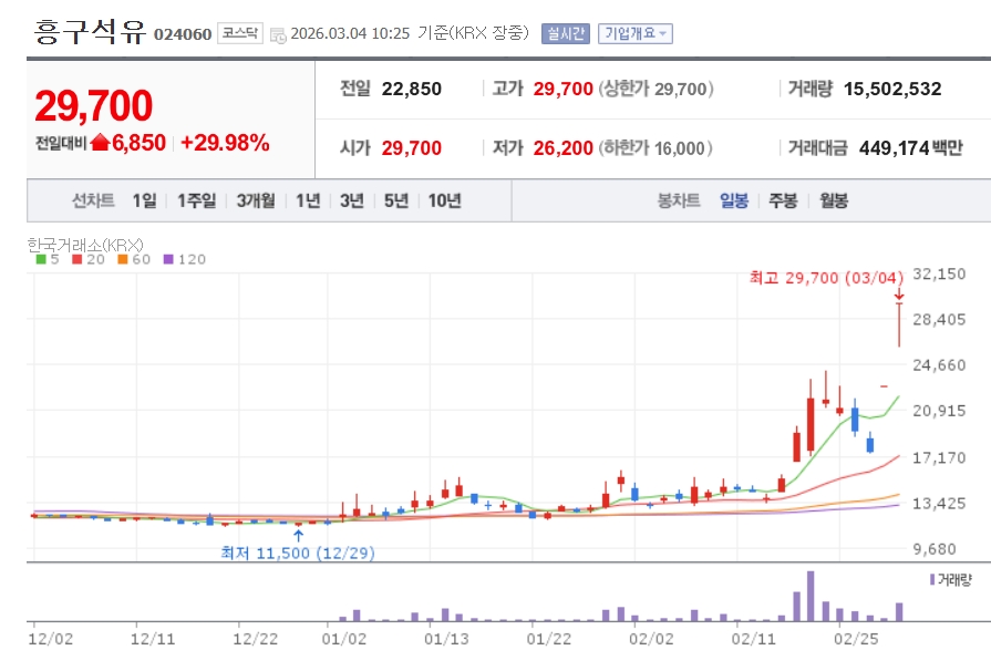 이미지 확대보기4일 한국거래소에 따르면 오전 10시25분 기준 코스닥 시장에서 흥구석유는 전 거래일 대비 29.98% 오른 2만970원에 거래되면서 상한가를 기록하고 있다. 중앙에너비스도 23.37% 오른 3만1150원에 거래되고 있다.