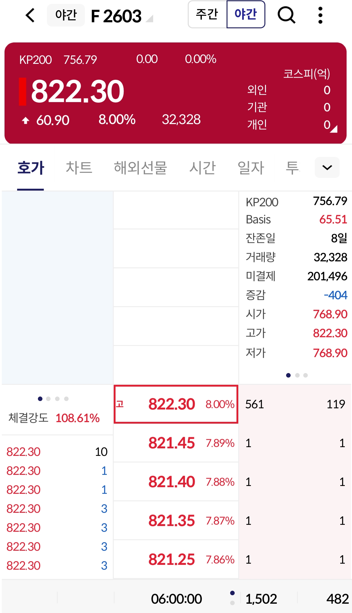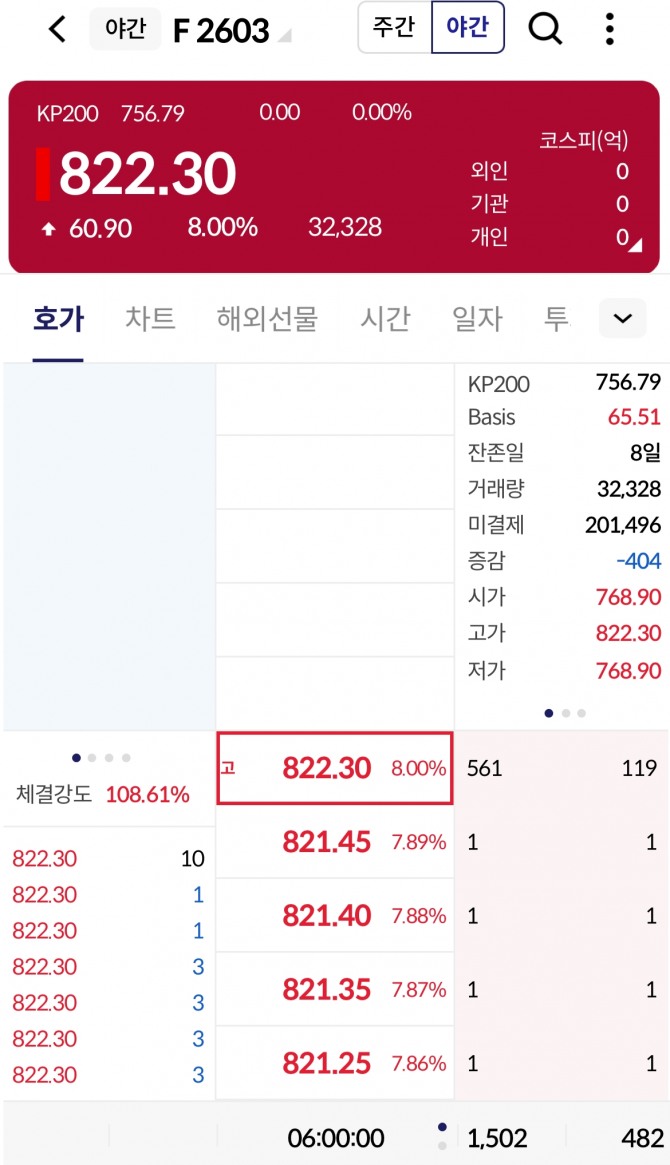 • 기록적 상승폭: 코스피200 야간선물(F 2603)은 전일 대비 60.90포인트(+8.00%) 폭등한 822.30으로 장을 마감했다.