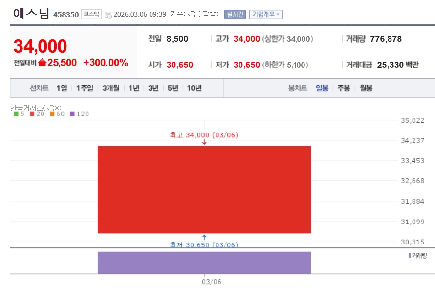 이미지 확대보기6일 한국거래소에 따르면 에스팀은 공모가(8500원) 대비 300% 오른 3만4000원에 거래되고 있다.