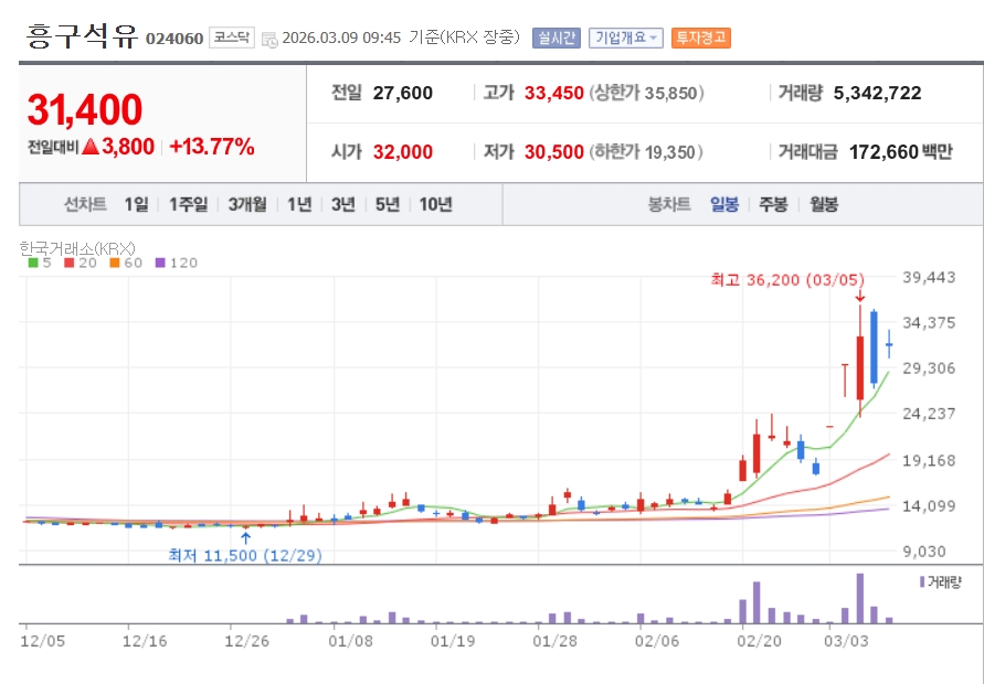 이미지 확대보기9일 한국거래소에 따르면 이날 오전 9시 45분 기준 흥구석유는 전 거래일에 13.77% 오른 3만1400원에 거래되고 있다. 한국석유는 전장 대비 12.04% 상승한 2만6500원을 기록 중이다.