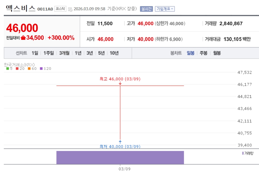 이미지 확대보기9일 한국거래소에 따르면 액스비스는 공모가(1만5500원) 대비 3만4500원(300%) 오른 4만6000원을 기록 중이다.
