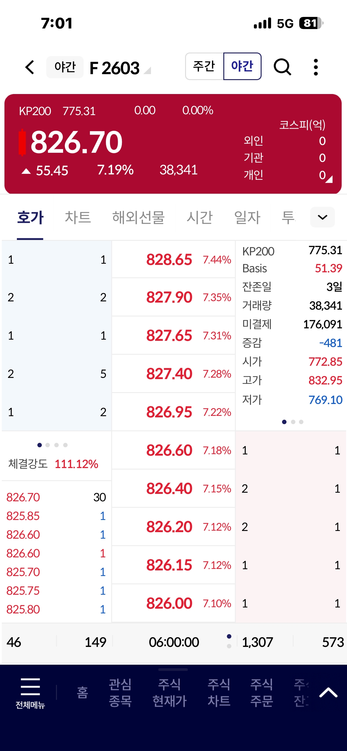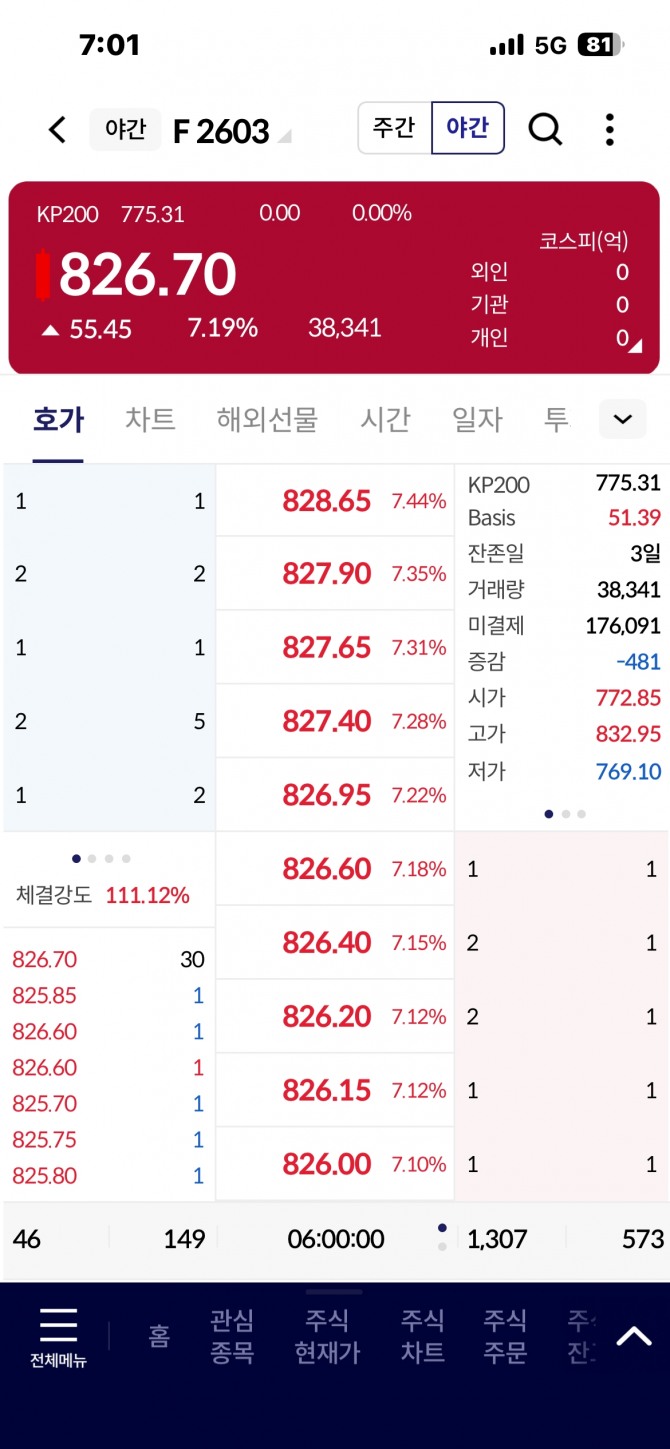 이날 야간 선물은 시가 772.85로 출발해 장중 고가 832.95까지 치솟는 등 시종일관 강한 매수 우위의 흐름을 보였다. 거래량은 3만 8341계약, 미결제약정은 17만 6091계약을 기록했으며, 체결강도는 111.12%로 집계되어 매수세가 매도세를 앞질렀다.