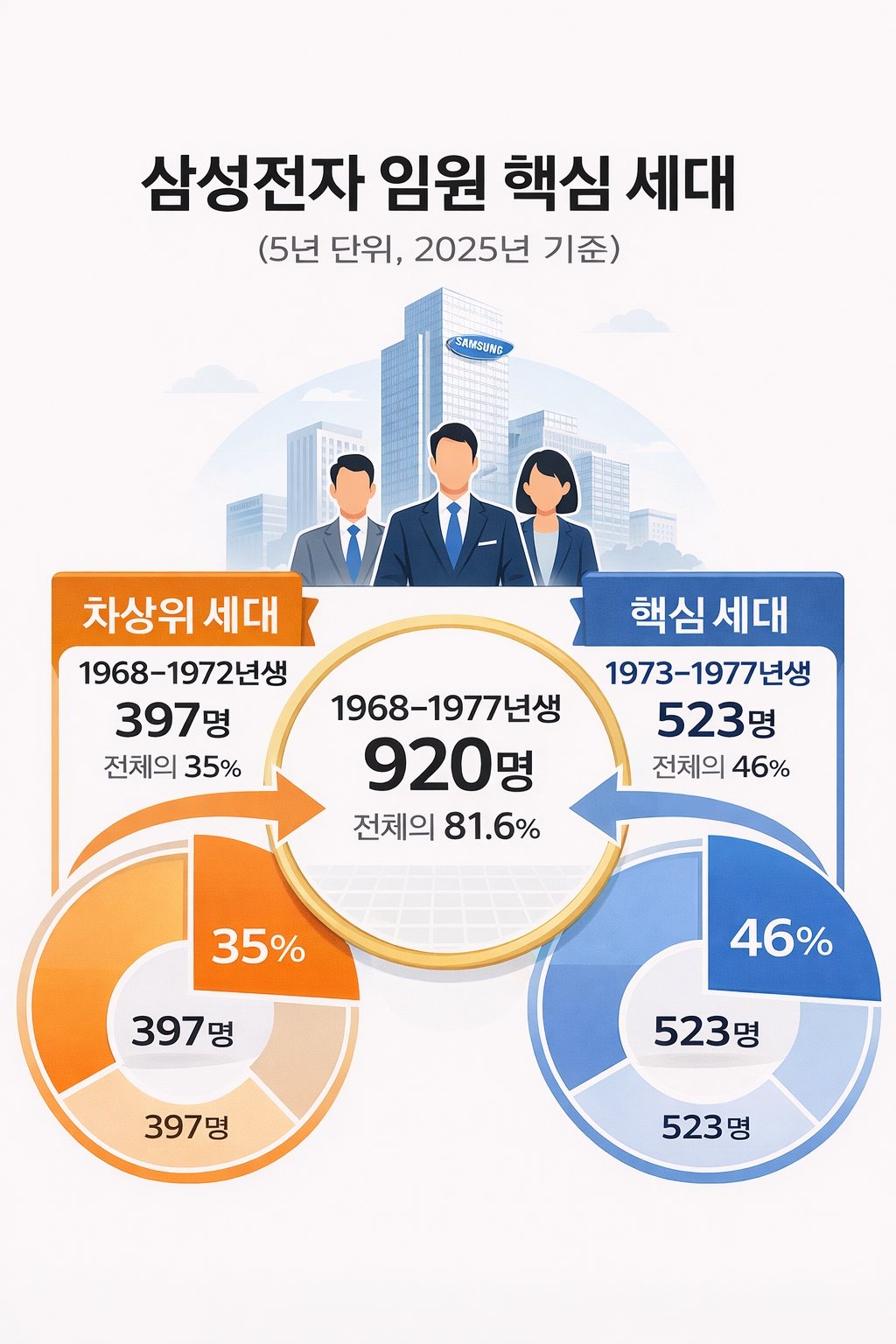 1980년대생 약진 : 반면, 1980년대생 임원은 지난해 46명에서 올해 61명으로 15명(+32.6%) 급증했다. 특히 2025년 보고서에는 1986년생(40세) 임원이 새롭게 명단에 이름을 올리며, 삼성이 연공서열을 타파하고 '젊은 리더'들을 단순한 상징이 아닌 현장의 실무 지휘관으로 전면 배치하기 시작했다는 강력한 신호를 보냈다.