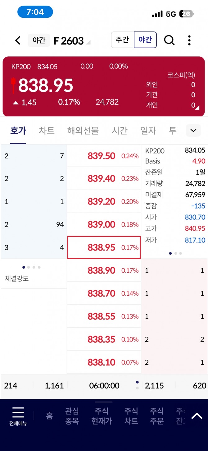 코스피200 야간선물, 전약후강 끝에 838.95 마감… 0.17% 소폭 상승