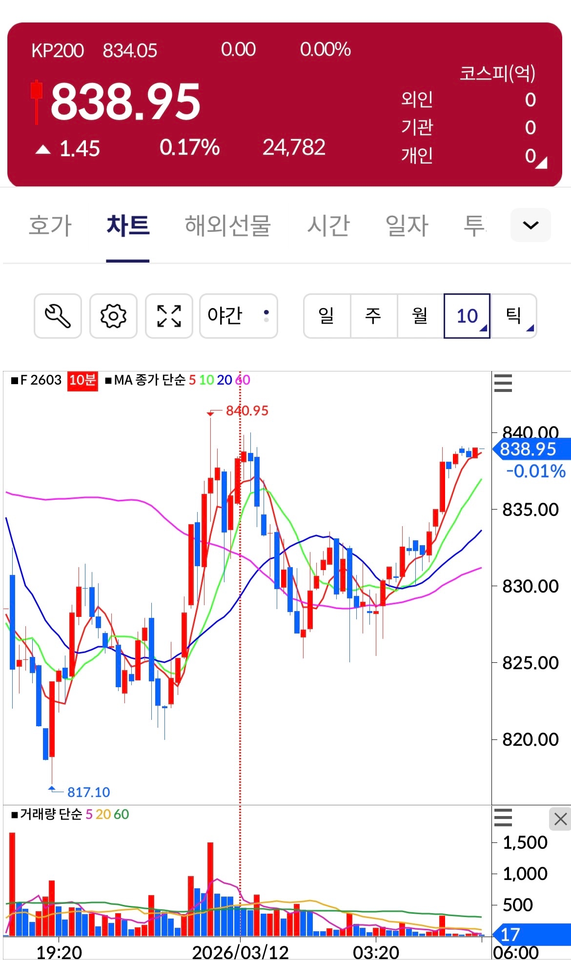 12일 한국거래소에 따르면, 코스피200 야간선물지수(F 2603)는 전일 주간 거래 종가 대비0.17%(1.45포인트) 상승한 838.95에 거래를 마쳤다.