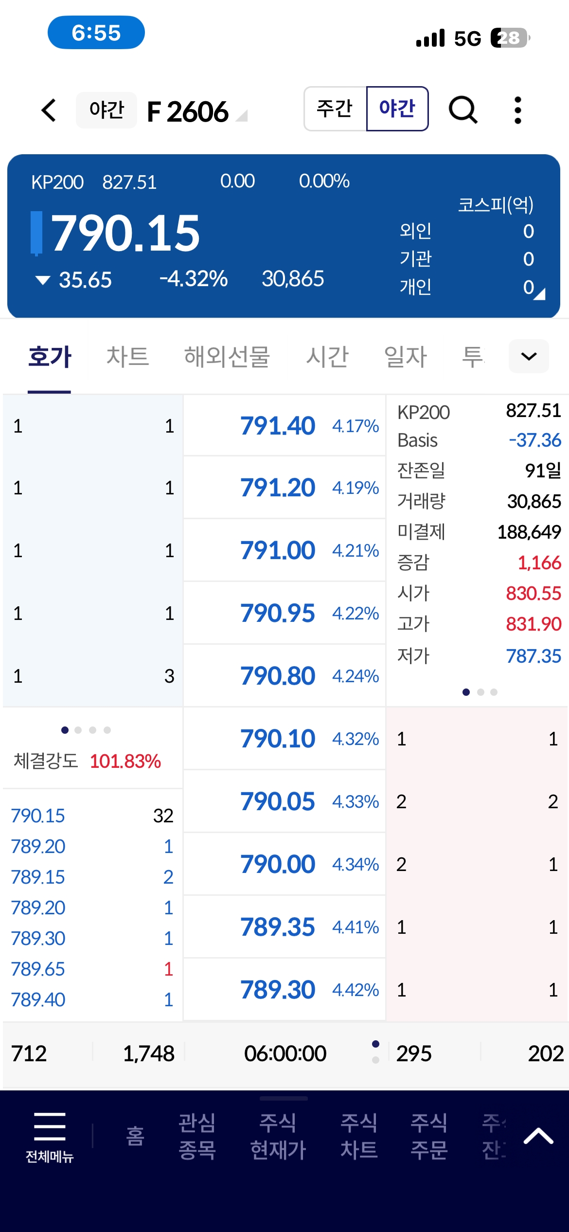 패닉 셀링: 자정(0시)을 기점으로 거래량이 폭발하며 지수가 수직으로 꺾였다. 825선 지지에 실패하자마자 매물이 쏟아진 형국이다.