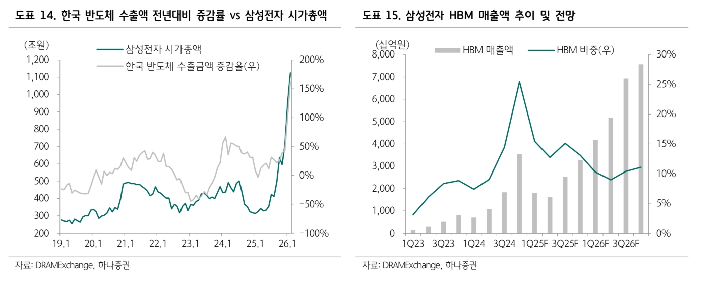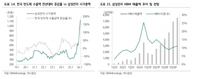 삼성전자의 연간 실적 전망도 상향했다. 하나증권은 올해 삼성전자의 연간 영업이익 전망치를 229조원으로 제시했다. 이중 메모리 부문이 차지하는 영업이익을 192조원에서 223조원으로 높여잡았다.