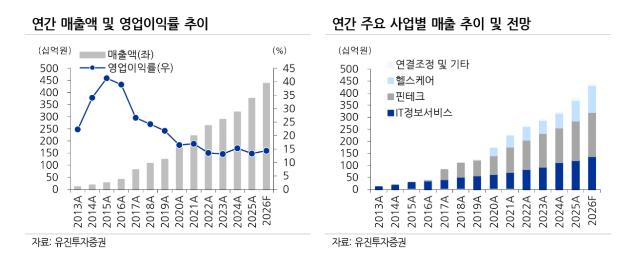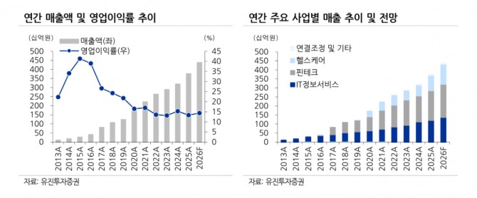 또한 "올해 연간 매출은 4373억원, 영업이익 629억원으로 전년 대비 각각 16.4%, 25.3% 증가가 기대된다"며 “IT정보서비스, 핀테크 및 헬스케어 사업부문이 전반적으로 안정적인 매출 성장과 함께 수익성 개선이 예상된다”고 덧붙였다.