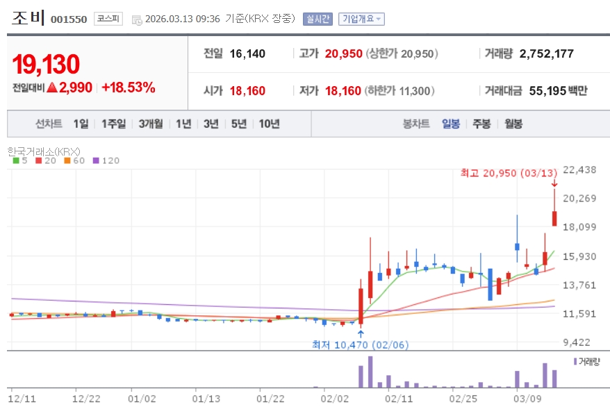 이미지 확대보기13일 한국거래소에 따르면 이날 오전 9시 36분 기준 조비는 전 거래일 대비 18.53% 오른 1만9130원에 거래되며 장초반 상한가로 직행했다. 남해화학도 23.83% 오른 1만810원에 거래되고 있다. 두 종목은 이날 코스피 등락률 1·2위에 나란히 이름을 올렸다. 이밖에 경농(13.07%), 효성오앤비(11.35%), 누보(7.17%) 등도 나란히 강세다.