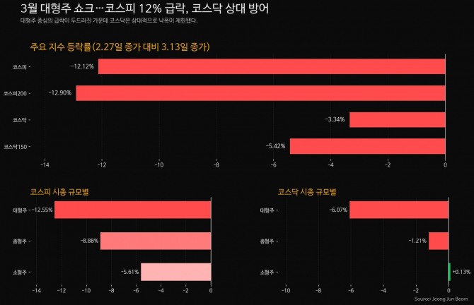 이미지 확대보기중동발 지정학적 긴장이 국내 증시의 허리인 대형주를 정조준하며 3월 증시를 뒤흔들었다. 3월 증시에서 코스피는 대형주 중심으로 12% 넘는 급락세를 보인 반면, 코스닥은 소형주 위주의 종목 장세가 펼쳐지며 지수 하락을 방어하는 ‘양극화’ 현상이 뚜렷하게 나타났다.