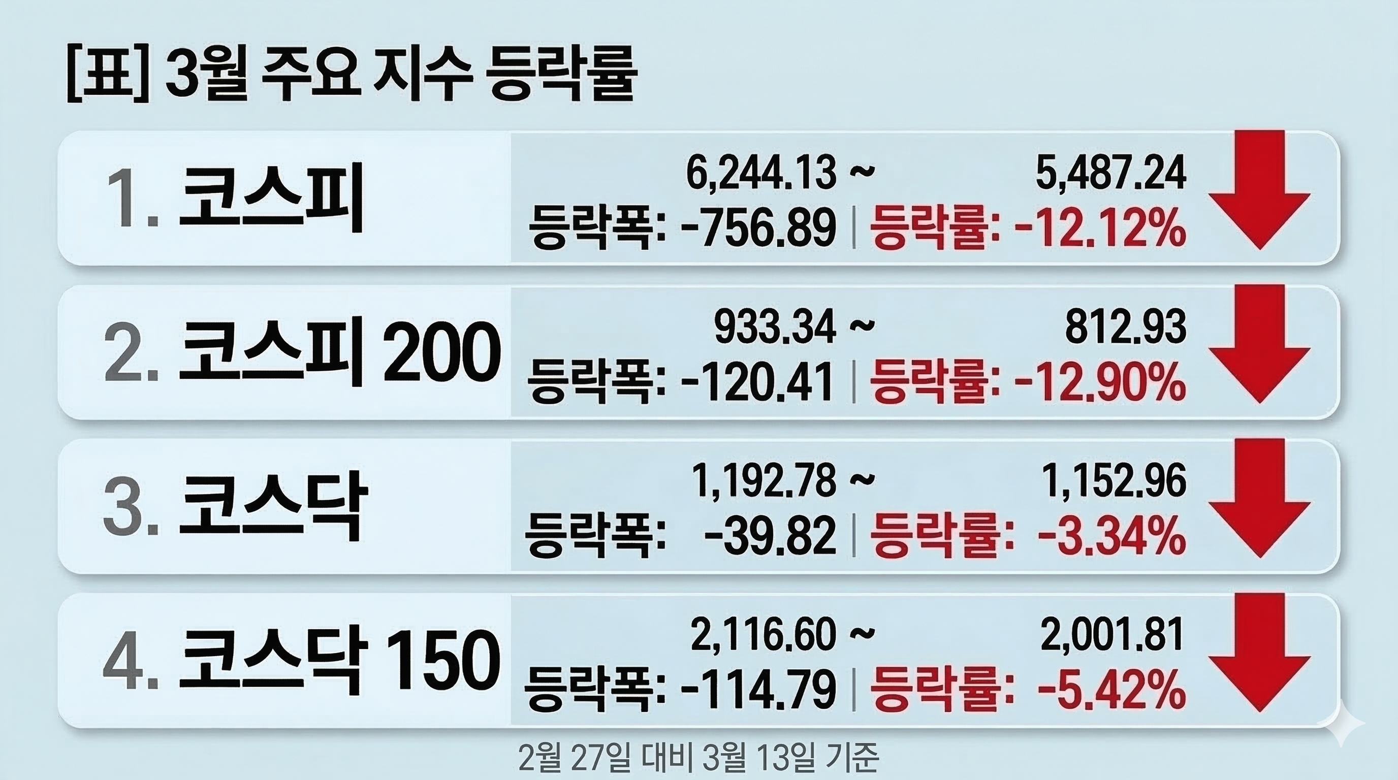 코스피는 이 기간 6244.13에서 5487.24로 756.89포인트 하락하며 12.12%의 하락률을 기록했다. 특히 시가총액 상위 200개 종목으로 구성된 코스피200 지수는 12.90% 하락해 시장 전체 평균보다 더 큰 타격을 입었다.
