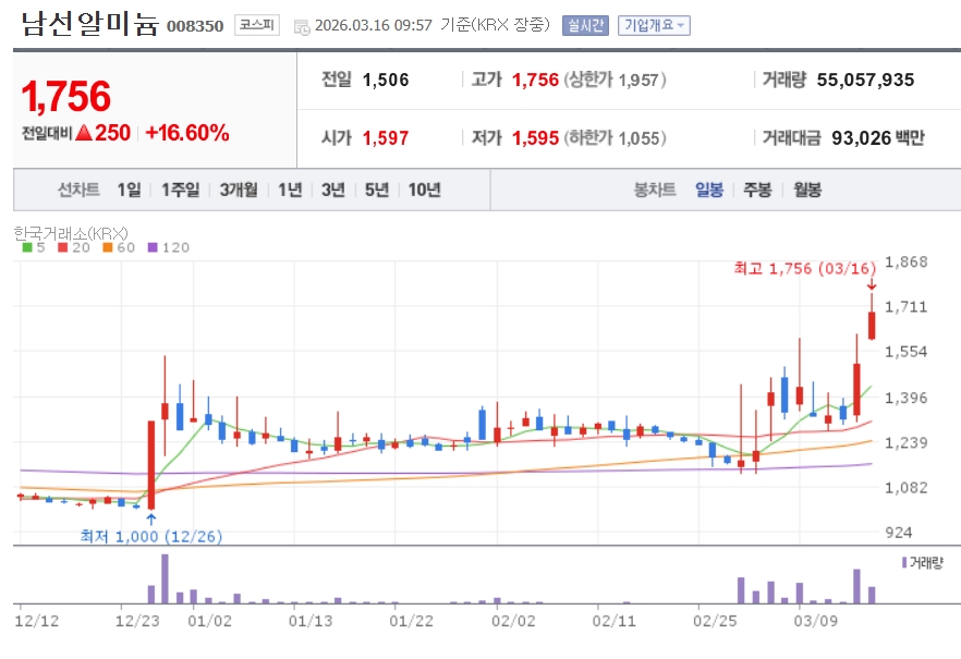 이미지 확대보기16일 한국거래소에 따르면 이날 오전 9시 57분 기준 남선알미늄은 전장 대비 16.60% 오른 1756원에 거래되고 있다. 삼아알미늄도 15.51% 상승한 3만9100원에 거래 중이다.