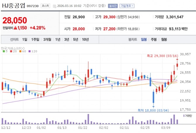 이미지 확대보기16일 한국거래소에 따르면 HJ중공업은 이날 오전 10시 02분 기준으로 전 거래일 대비 4.28% 오른 2만 8050원에 거래되고 있다.