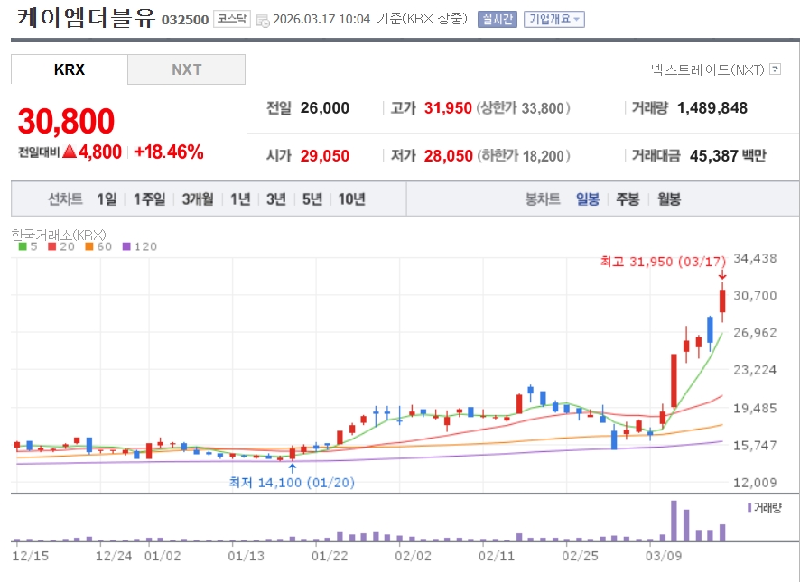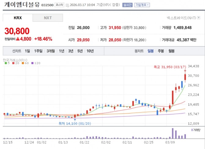 이미지 확대보기17일 한국거래소에 따르면 오전 10시04분 케이엠더블유는 전 거래일 대비 18.46% 오른 3만800원에 거래되고 있다. 이날 장중 3만1950원을 터치하며 52주 '신고가'를 경신했다.