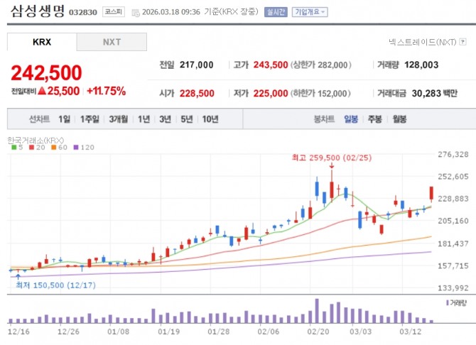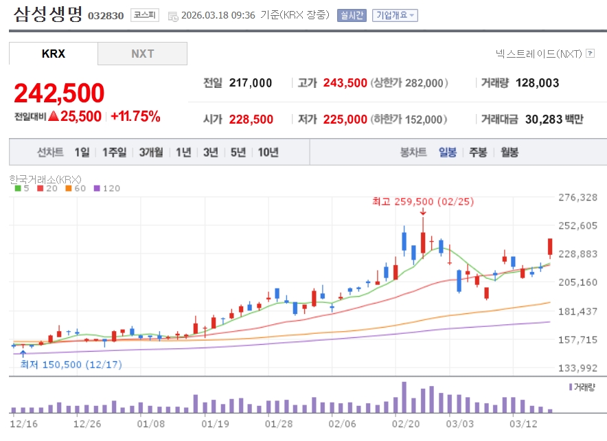이미지 확대보기18일 한국거래소에 따르면 이날 현재 삼성생명은 전거래일 대비 11.75% 오른 24만2500원에 거래 중이다. 한화생명은 7.52% 오른 5150원에, 미래에셋생명은 6.91% 오른 1만8710원에 거래되고 있다. 동양생명도 3.77% 올랐다.