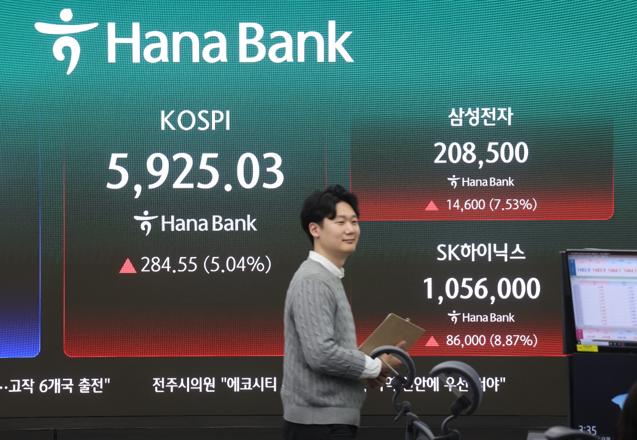 코스피 지수가 5% 상승한 5920선에 안착하며 거래를 마감했다. 유가증권시장은 외인·기관 쌍끌이 매수로 인해 코스피가 3일 연속 상승했으며 삼성전자는 7.5% 상승한 20만8500원, SK하이닉스는 8.8% 상승한 105만6000원에 장을 마쳤다.