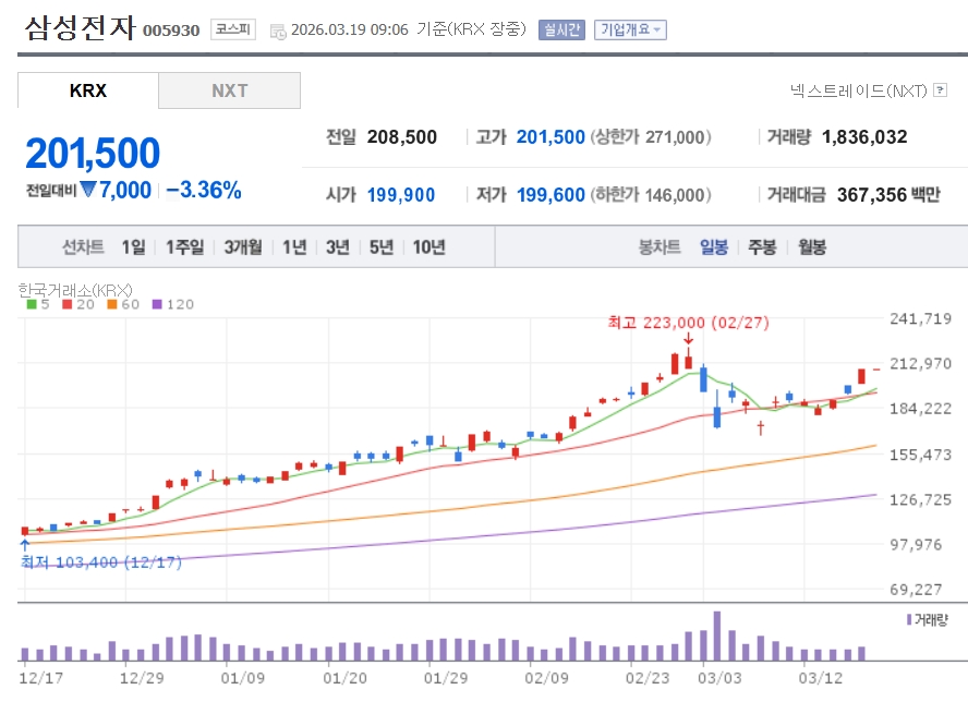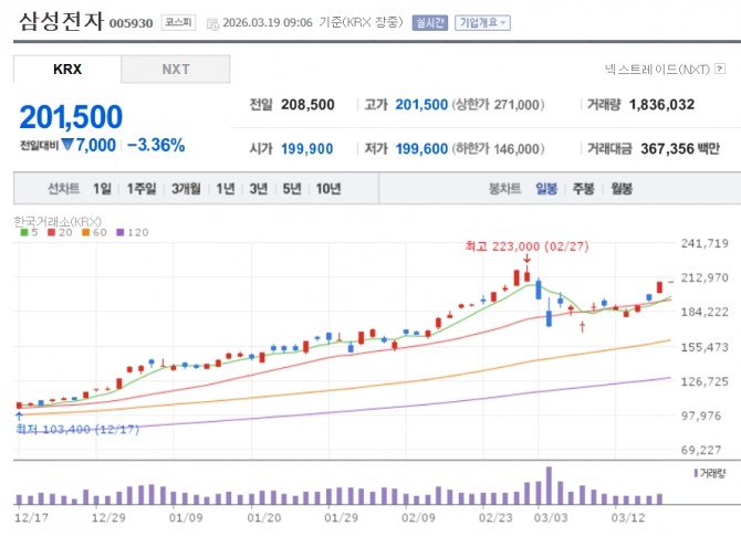 이미지 확대보기19일 한국거래소에 따르면 오전 9시 6분 현재 코스피 시장에서 삼성전자는 전 거래일 대비 3.36% 내린 20만1500원, SK하이닉스는 3.13% 하락했다. SK하이닉스 최대 주주이자 투자 지주사인 SK스퀘어도 2.38% 하락세다.
