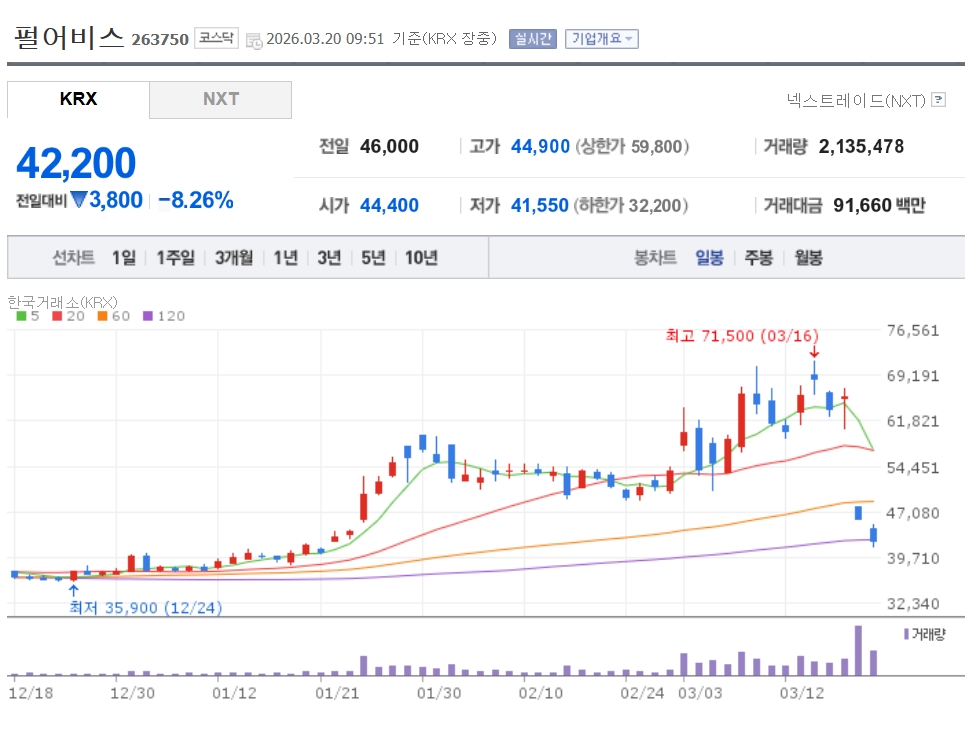 이미지 확대보기20일 한국거래소에 따르면 펄어비스는 이날 오전 9시 51분 기준 전 거래일 대비 8.26% 하락한 4만2200원을 기록 중이다. 펄어비스는 전일 하한가를 기록한 바 있다.