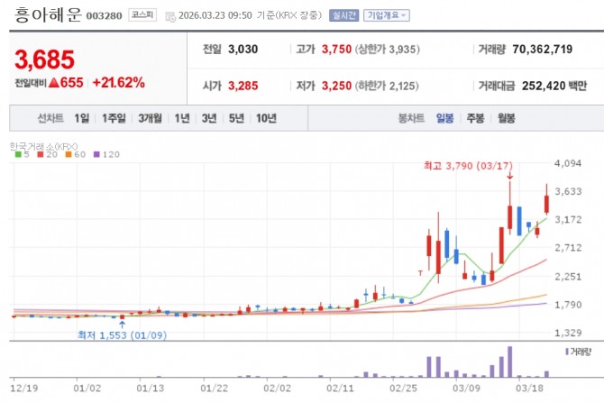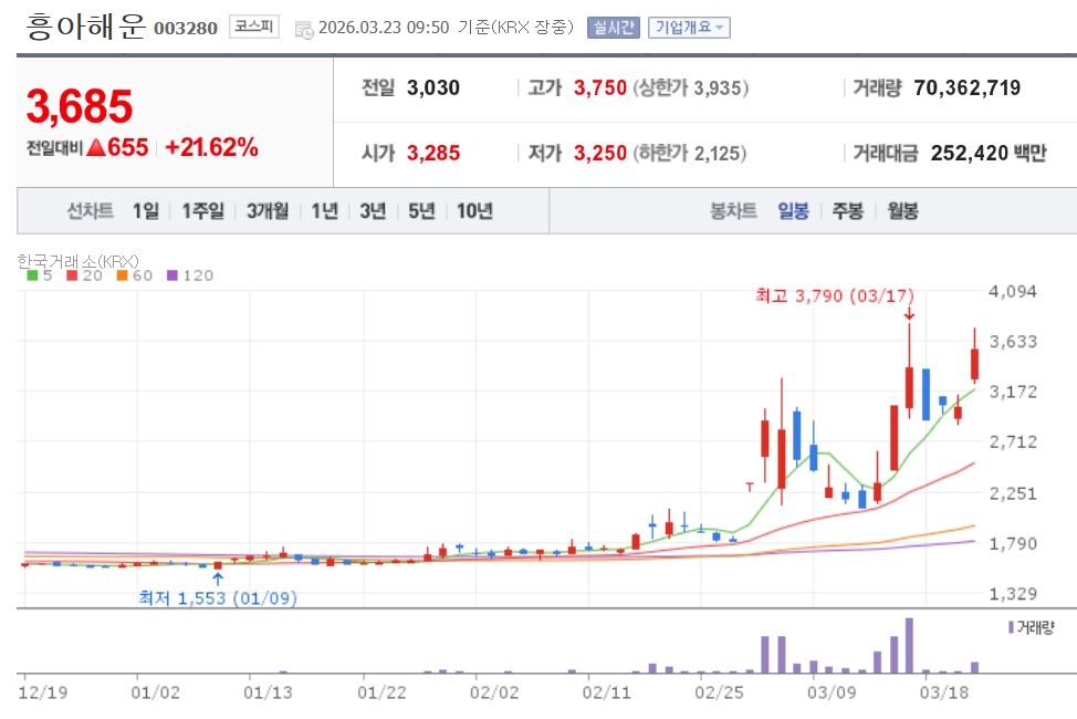 이미지 확대보기23일 한국거래소에 따르면 이날 오전 9시50분 기준 흥아해운은 전 거래일 대비 21.62% 오른 3685원에 거래중이다.