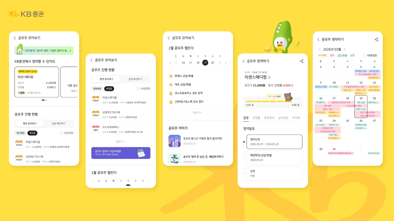 또한 '공모주 캘린더'를 기존 리스트 형태에서 달력형으로 개편해 수요예측, 청약, 납입 및 환불, 상장일 등 주요 일정을 한눈에 확인할 수 있도록 했다. KB증권에서 청약 가능한 종목만 선별해 볼 수 있는 기능도 추가됐다.