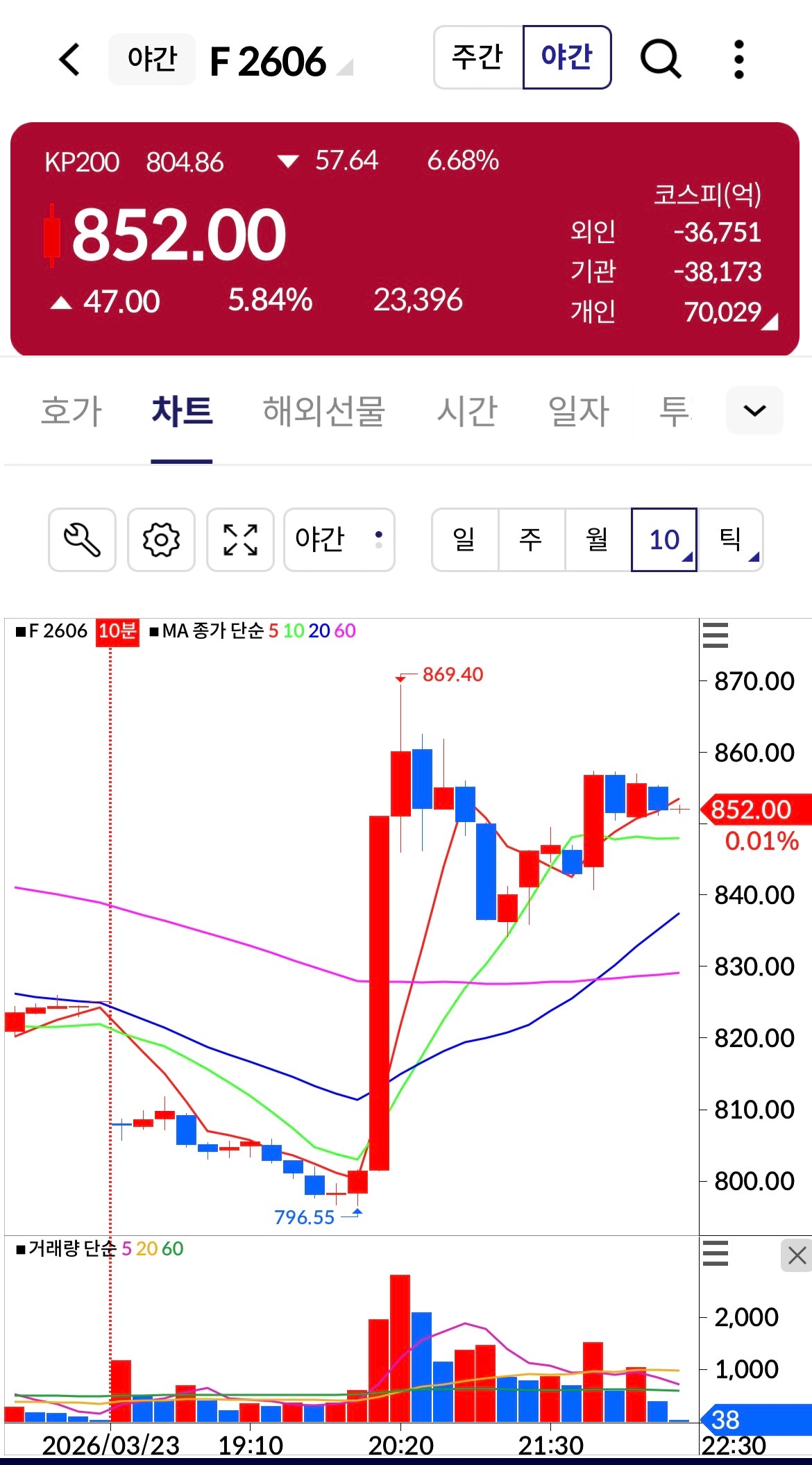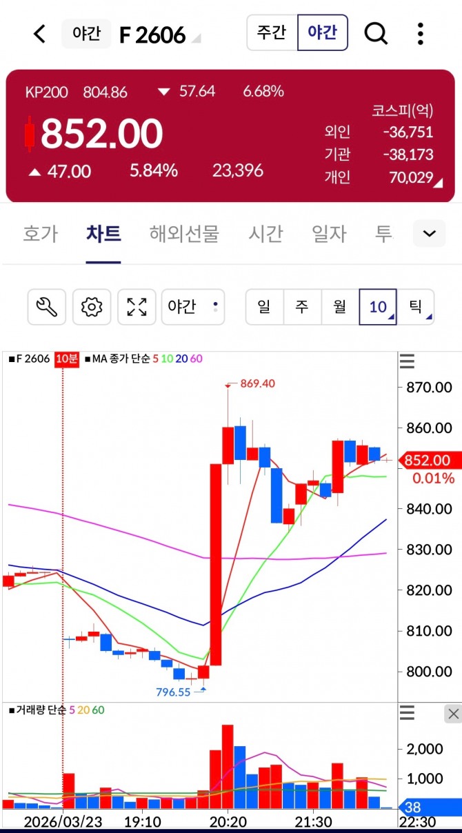 이날 오후 10시 24분 기준, 코스피200 야간선물 지수는 23일 정규 거래 종가 대비 5.84%(47.00포인트) 급등한 852.00에 거래되고 있다.