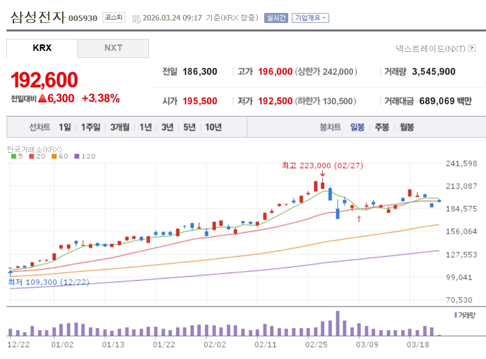 이미지 확대보기24일 한국거래소에 따르면 오전 9시17분 현재 삼성전자는 전날 대비 3.38% 오른 19만2600원에 거래되고 있다. SK하이닉스는 전날 대비 5.57% 오른 98만5000원을 나타내고 있다. 두 종목이 상승하는 것은 4거래일 만이다.