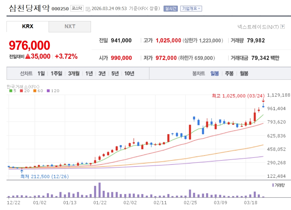 이미지 확대보기24일 한국거래소에 따르면, 이날 오전 9시53분 삼천당제약은 전거래일 대비 3.72% 오른 97만6000원에 거래되고 있다. 장중 한때 102만5000원까지 오르며 주당 100만원을 돌파하는 ‘황제주’에 등극했다. 현재 코스닥 시가총액 1위 자리를 지키고 있다.