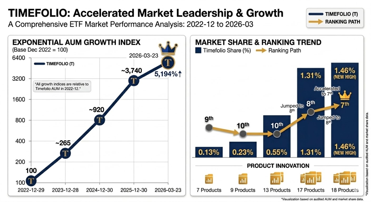 같은 기간 전체 ETF 시장 규모가 78.5조 원에서 369.6조 원으로 약 4.7배 커진 것과 비교하면, 타임폴리오의 성장 속도는 시장 평균보다 11배 이상 빠르다. 상품 수 역시 7개에서 18개로 늘어나며 라인업을 견고히 다졌다.