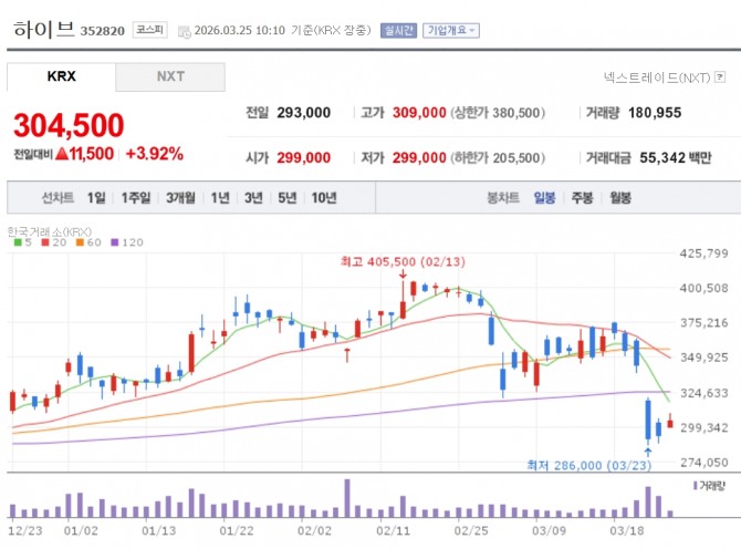 이미지 확대보기25일 한국거래소에 따르면 하이브는 이날 오전 10시 10분 기준 전 거래일 대비 3.92% 오른 30만4500원을 기록하고 있다. 앞서 하이브 주가는 21일 BTS 공연 후 첫 거래일인 월요일에 17% 하락한 바 있다.