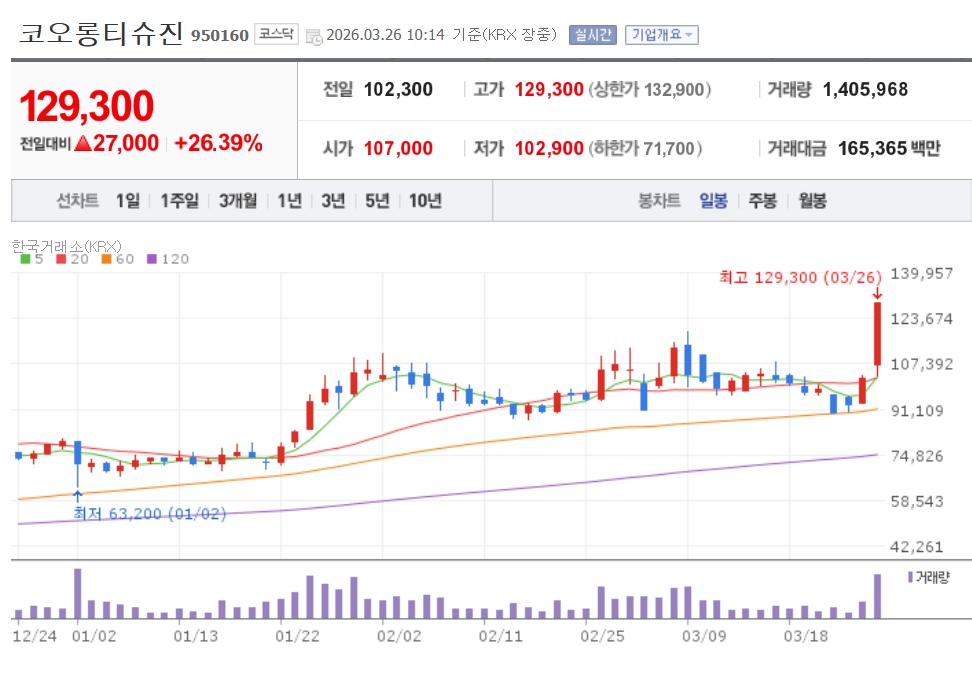 이미지 확대보기26일 한국거래소에 따르면 오전 10시 14분 기준 코오롱티슈진은 코스닥 시장에서 전 거래일 대비 26.39% 오른 12만9300원에 거래되고 있다.