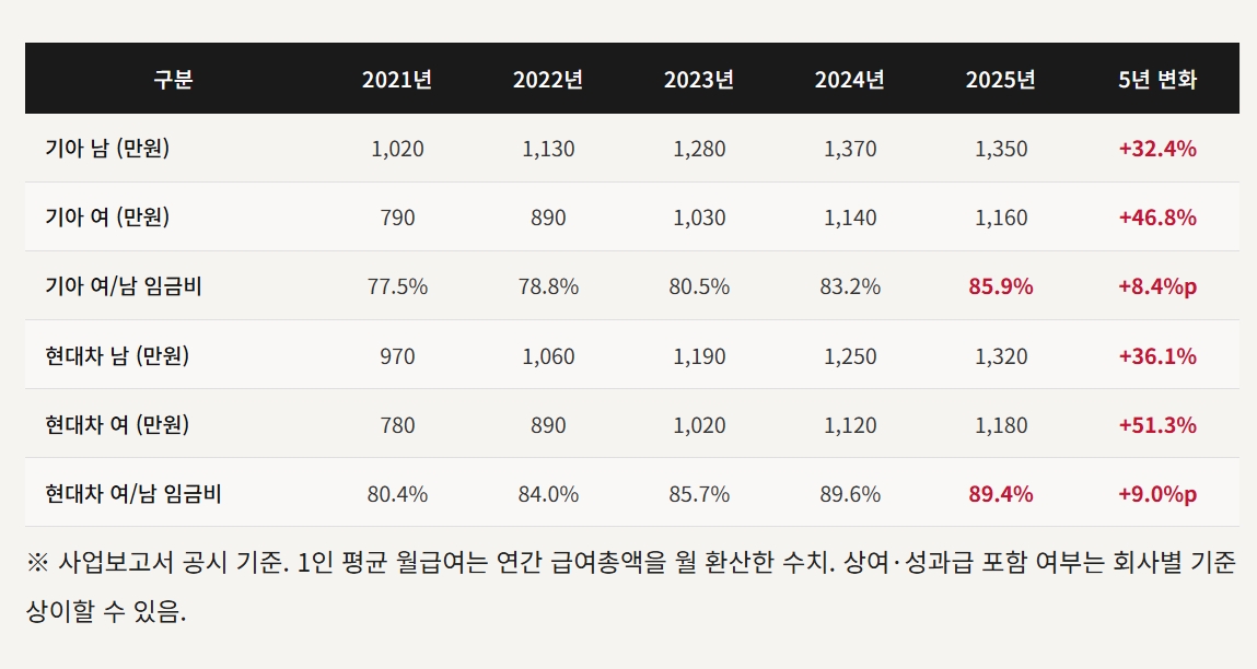 현대자동차와 기아가 지난 5년간(2021~2025년) 사업보고서에 공시한 성별 급여 데이터를 분석한 결과, 두 회사 모두 여성 대비 남성의 임금 격차를 뚜렷하게 줄인 것으로 나타났다. 다만 2025년 현재도 여성 직원의 1인 평균 월급여는 남성의 86~89% 수준에 머물러 있으며, 그 격차의 상당 부분은 제도적 차별보다 '근속연수 구조'에 기인하는 것으로 해석된다.기아는 계약직 4배 폭증, 현대차는 여성 비율 확대로 각각 다른 방향성을 보여