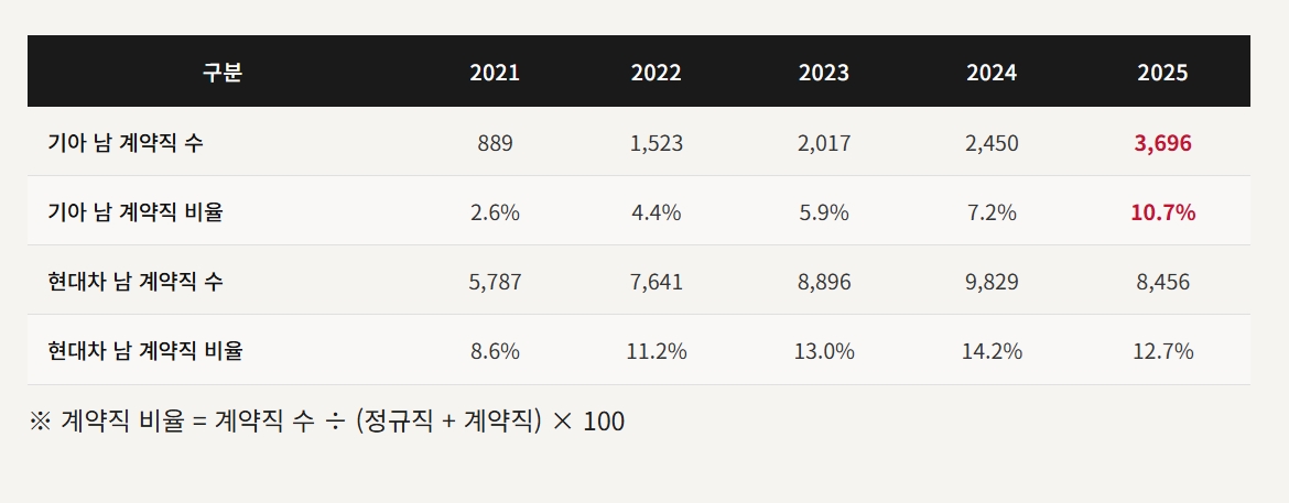 이번 분석에서 가장 주목해야 할 변화는 기아의 계약직 급증이다. 기아 남성 계약직 수는 2021년 889명에서 2025년 3,696명으로 4배 이상 늘었다. 남성 전체 인력 중 계약직 비율은 2.6%에서 10.7%로 치솟았다. 같은 기간 정규직 남성은 33,187명에서 30,968명으로 오히려 2,200명 줄었다.