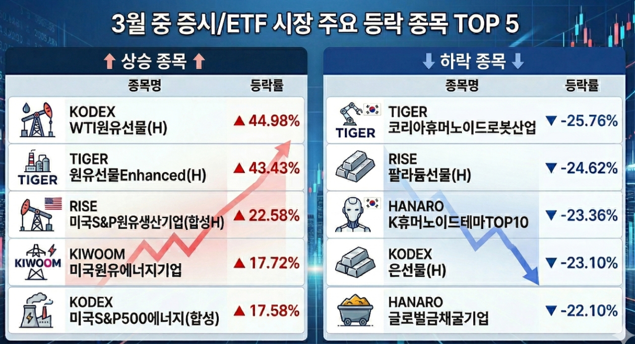 반면 시장의 다른 축은 크게 흔들렸다. 로봇·자동차·소비재 관련 ETF는 20% 안팎 급락하며 에너지와 비에너지 간 흐름이 극명하게 엇갈렸다. 특히 성장 기대감으로 올랐던 테마형 ETF는 금리 상승 우려까지 겹치며 낙폭이 확대됐다.