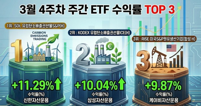 30일 글로벌이코노믹이 국내 상장 ETF(레버리지와 인버스제외)를 전수 조사한 결과, 지난 20일 종가 대비 27일 종가 기준 주간 수익률 상위 10개 종목 중 4개 종목이 탄소배출권 관련 ETF인 것으로 나타났다. 가장 높은 수익률을 기록한 ‘SOL 유럽탄소배출권선물S&P(H)’는 한 주간 11.29% 급등했으며, ‘KODEX 유럽탄소배출권선물ICE(H)’ 역시 10.04%의 수익률을 기록했다. 이들 종목은 올해 초부터 3월 중순까지 누적 수익률이 -20% 수준에 머물며 하락률 상위권에 포진했던 대표적인 소외주였다는 점에서 이번 반등은 더욱 극적이다.